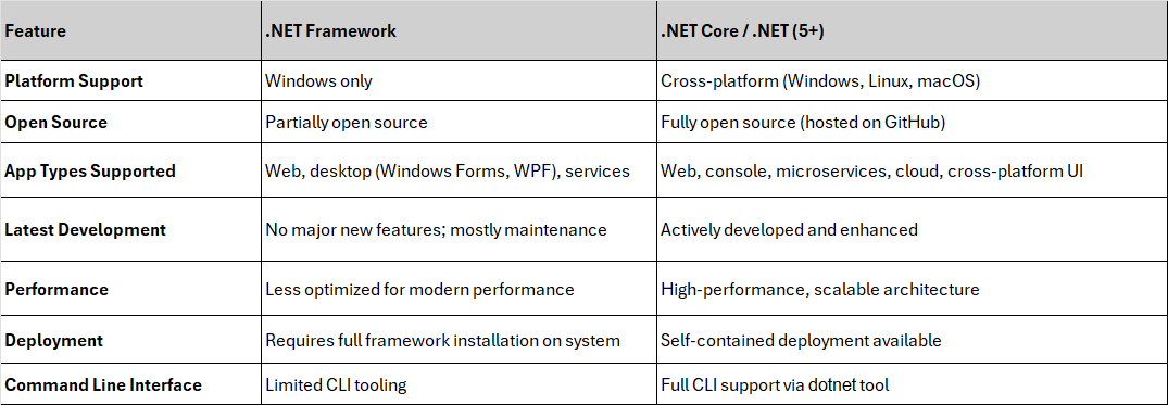 Windows-Only: Unlike .NET Core or .NET 5+, the .NET Framework runs only on Windows OS.